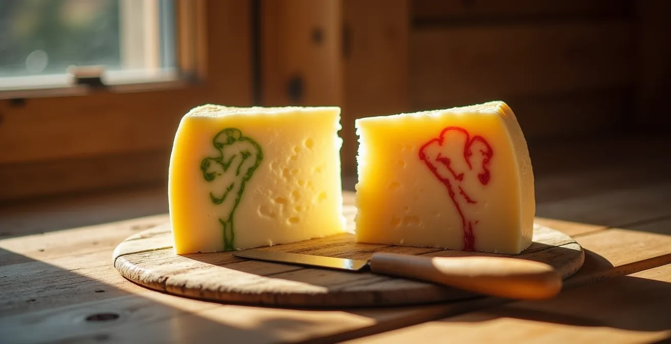 Car derrière cette simple pastille de caséine se cache un monde de différences, un fossé philosophique et gustatif. La véritable expertise ne consiste pas à réciter un code couleur, mais à raconter l’histoire qui se cache derrière. L’un est le fruit d’un seul troupeau, d’un lait transformé encore chaud de la traite, capturant l’essence volatile des fleurs d’alpage. L’autre est le résultat d’une collecte, d’une standardisation nécessaire, d’un lait qui a voyagé. L’un parle le langage du terroir brut, l’autre celui de la régularité.